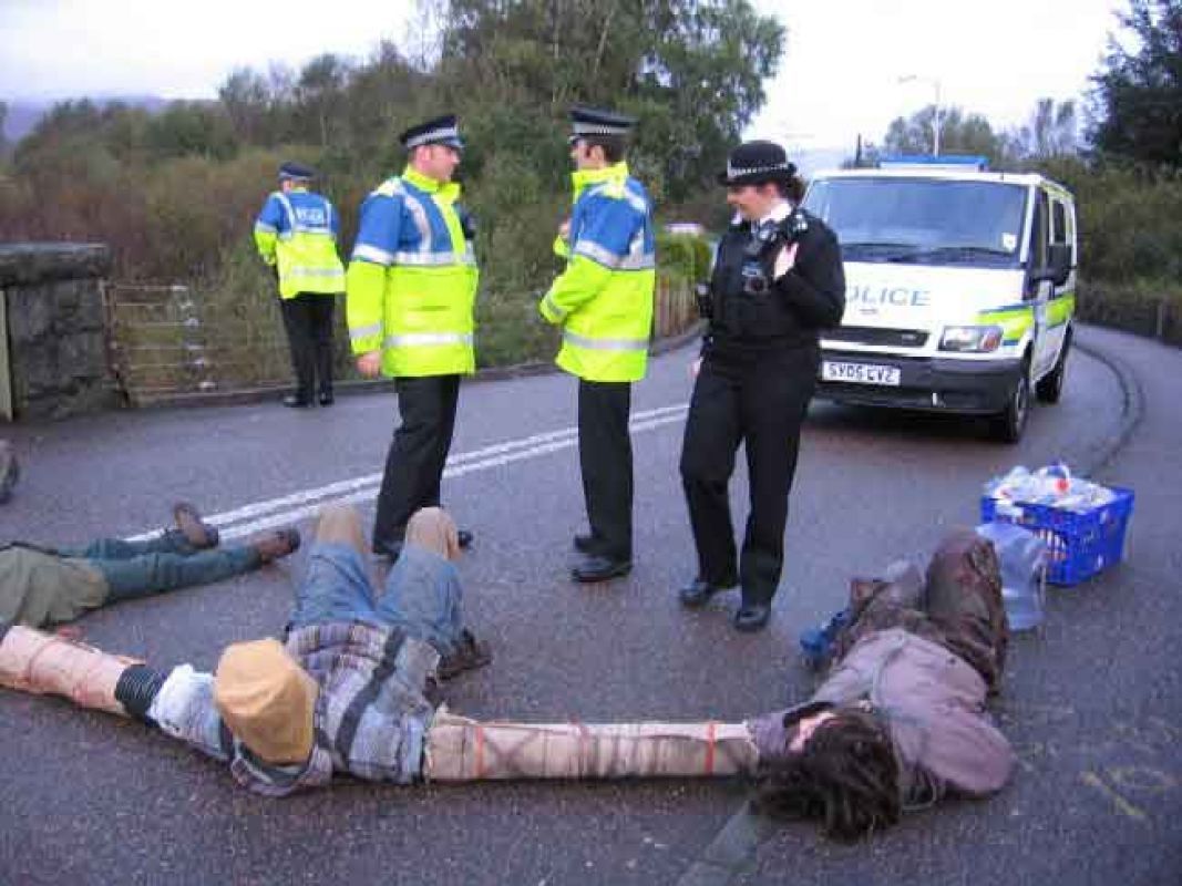 Five people locked together using lock-on tubes blocking the only access road and denying entry to vehicles supplying equipment essential in the infrastructure and operation of the ALCAN smelter at Fort William, Scotland. The blockade started at the beginning of the morning shift change and lasted for almost five hours.